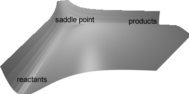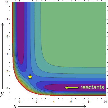 A contour plot for a typical reaction AB+C→ A+BC is shown below. The star is a saddle point called the transition state, it is where the exchange reaction takes place.