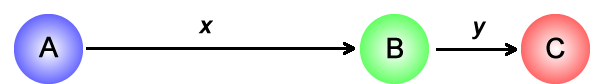 Consider letting go of a single mass placed on a smooth frictionless surface with various extrema. Using reduced mass coordinates, a collinear triatomic system can be reduced to just that, a single mass on a potential energy surface. The three atoms and their relative coordinates x and y are shown here.